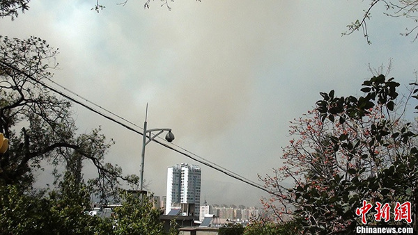 2月28日2时30分,昆明市宜良县阳宗海林场小白龙林区发生森林火情。凌晨4点,火线已经扩大到500米。截止11时,火势还未得到控制,2000余人正在火场紧急扑救。图为县区内浓烟密布。