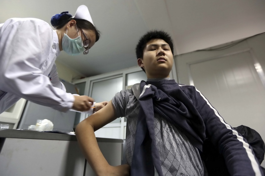 护士在为王一竹打动员针(2月26日摄)