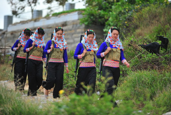 7月31日,虎豹关海防哨所的女民兵和惠安边防大队女兵一起进行海防前线的海空监控演练