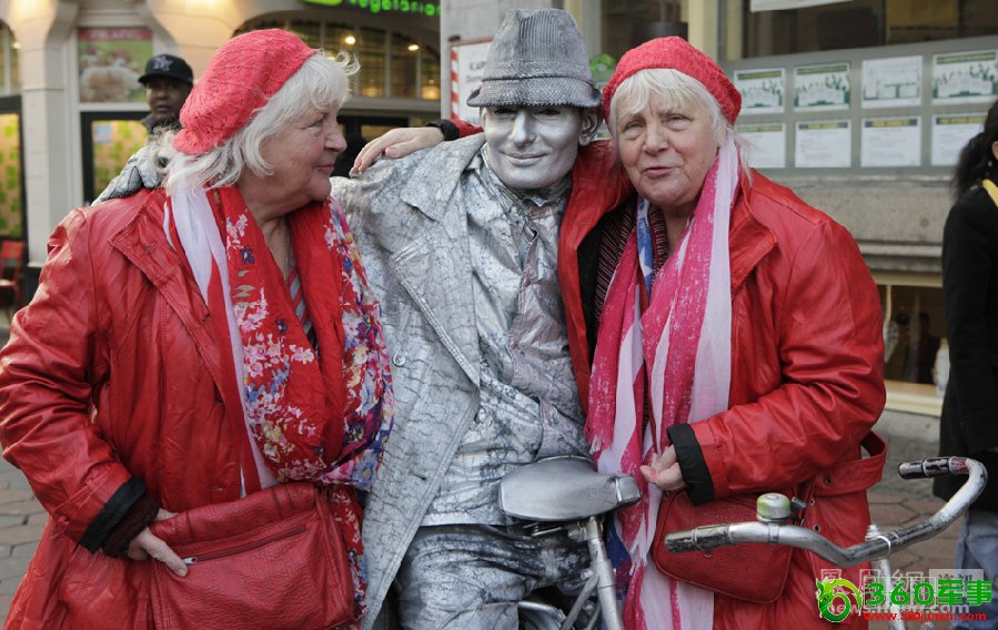 图为Louise(左)和Martine在阿姆斯特丹市中心与一名街头表演艺术家合影。