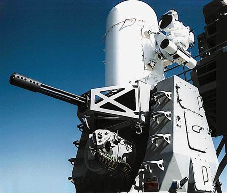 "密集阵"近战武器系统(CIWS)是一种可实现快速火力打击、通过雷达和光电制导的火炮系统,该系统可用来防御反舰导弹和多种水面威胁"密集阵"系统的火炮直径为20毫米,每分钟最多可发射4500枚穿甲弹。