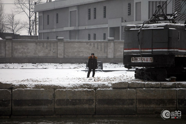 2月12日,朝鲜新义州,鸭绿江边巡逻的朝鲜士兵,鸭绿江作为中朝边境的界河,可以允许船只行驶在江面上,但不可以上岸,否则视为越境。