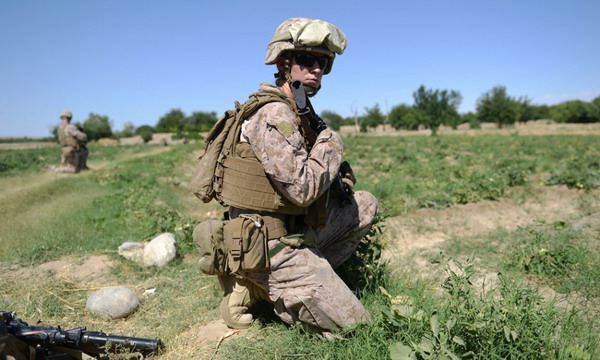 2012年6月6日,美国海军陆战队陆战第7团第1营所属女性战斗员正在阿富汗的赫尔曼德省地区进行战地巡逻。参加巡逻的女兵并没有因为性别而受到“照顾”,每个人都荷枪实弹全副武装以便随时战斗。
